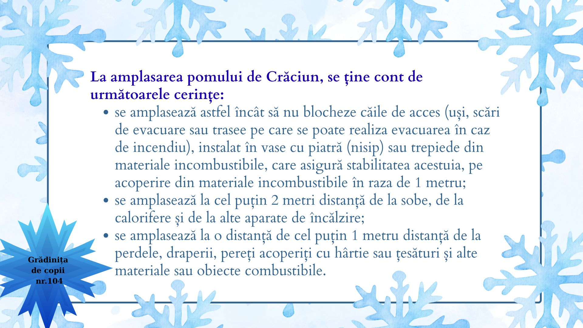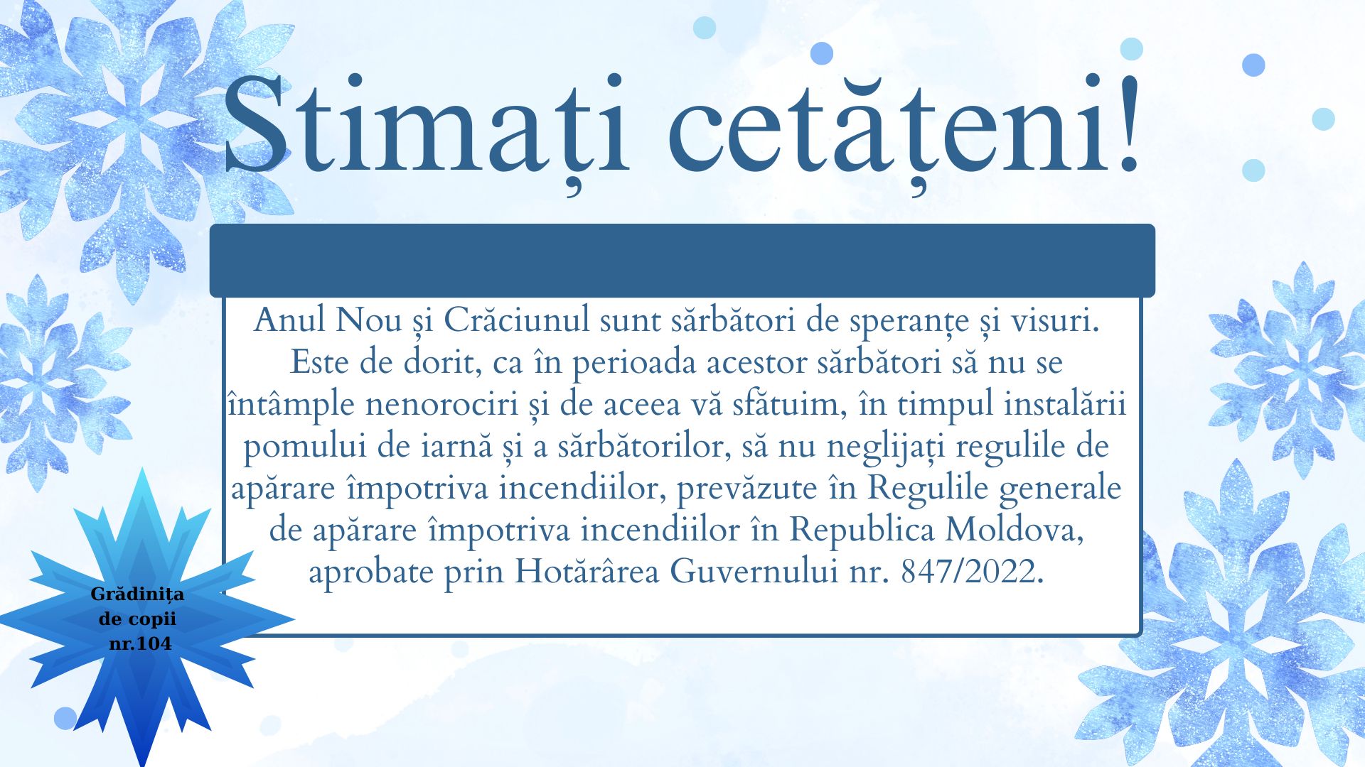 Instituția de educație timpurie nr.104, susține alimentația rațională și echilibrată a copiilor, care oferă energia si nutrimentele necesare unei creșteri și dezvoltări psihosomatice normale. Alimentația sănătoasă crește imunitatea copilului, îmbunătățește sănătatea și buna funcționare a organismului.